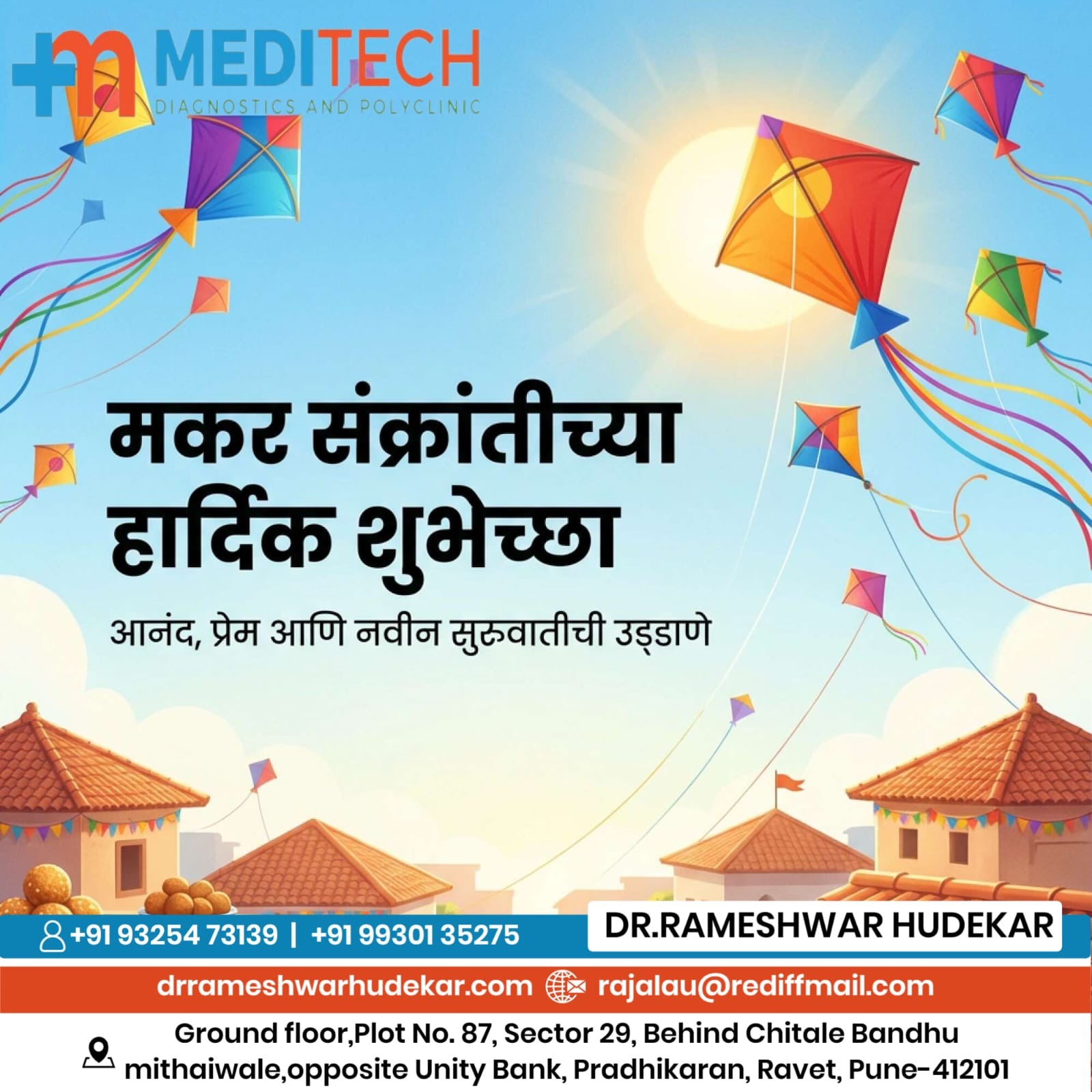 ## π₯ Makar Sankranti Special Offers at MEDITECH DIAGNOSTICS AND POLYCLINIC RAVET! π― Wishing a happy Makar Sankranti to all! May this festival of harvest bring prosperity and joy to your lives. ποΈ At MEDITECH DIAGNOSTICS AND POLYCLINIC RAVET, we understand the importance of health during this festive season. We're offering special discounts on our comprehensive health checkups and consultations to ensure you stay healthy and celebrate with peace of mind. π£ Book your appointment today and avail these exclusive offers!
